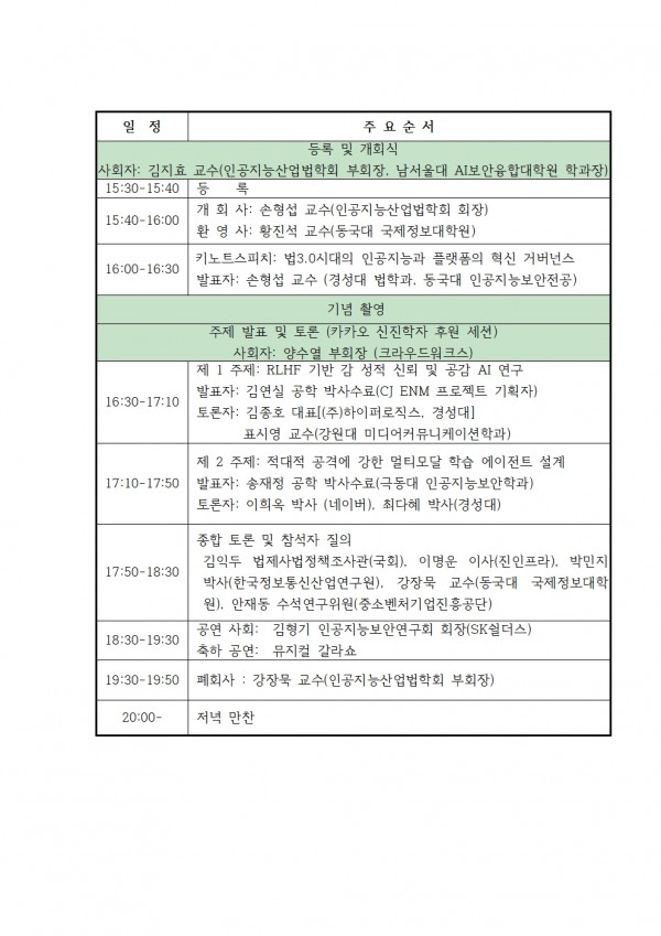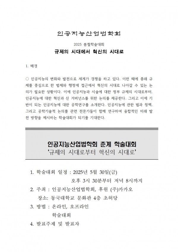 2025년 춘계학술대회 프로그램 페이지 정보 작성자 최고관리자 댓글 0건 조회 88회 작성일 25-05-23 09:49 목록 본문 춘계학술대회 프로그램 이전글2025년 춘계학술대회 포스터 25.05.23 다음글인공지능산업법학회 신년 학술대회 25.02.28 댓글 0 댓글목록 등록된 댓글이 없습니다.